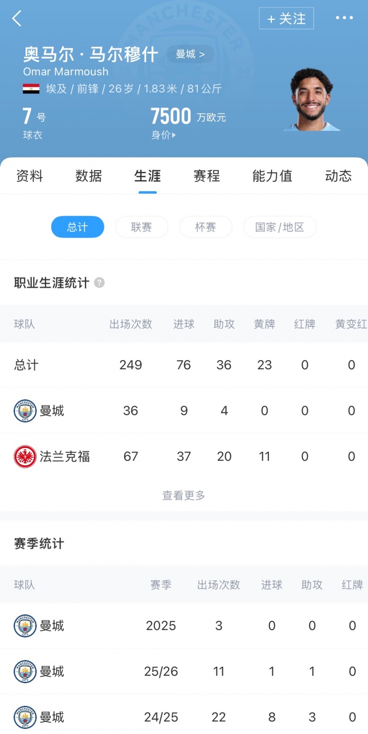 7500万买来当替身! 26岁的马尔穆什本赛季11场比赛打进1球 以29.5万的周薪排名曼城第三位